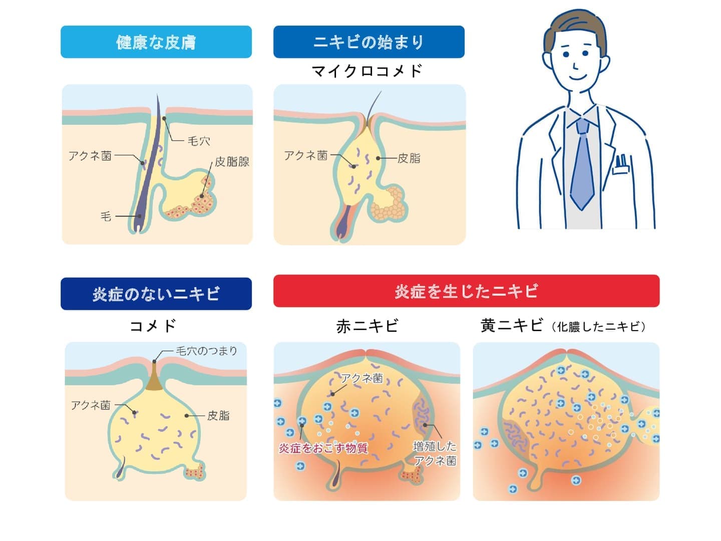 にきびは、毛穴の出口が角質で詰まることから始まり、皮脂が貯まり、アクネ菌が増殖して炎症を起こします。通常、顔、背中、胸などの皮脂腺が多い部位に現れます。